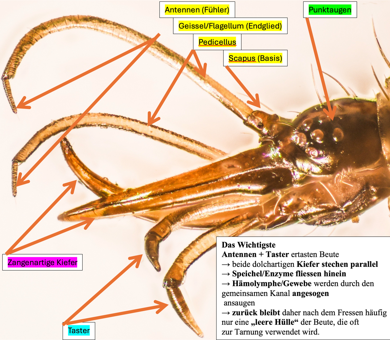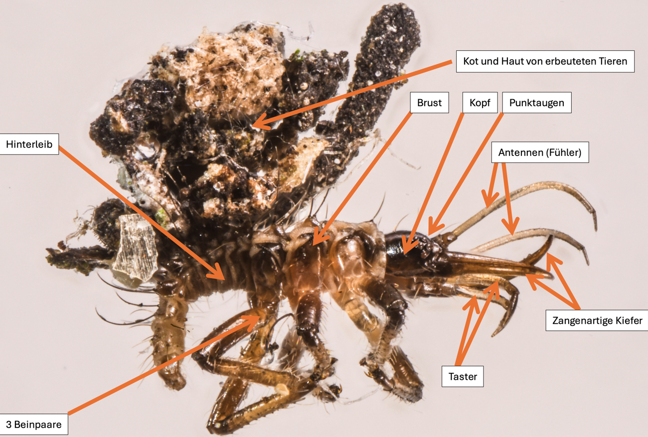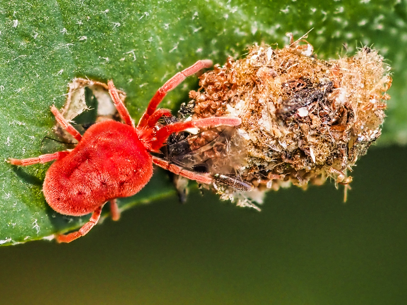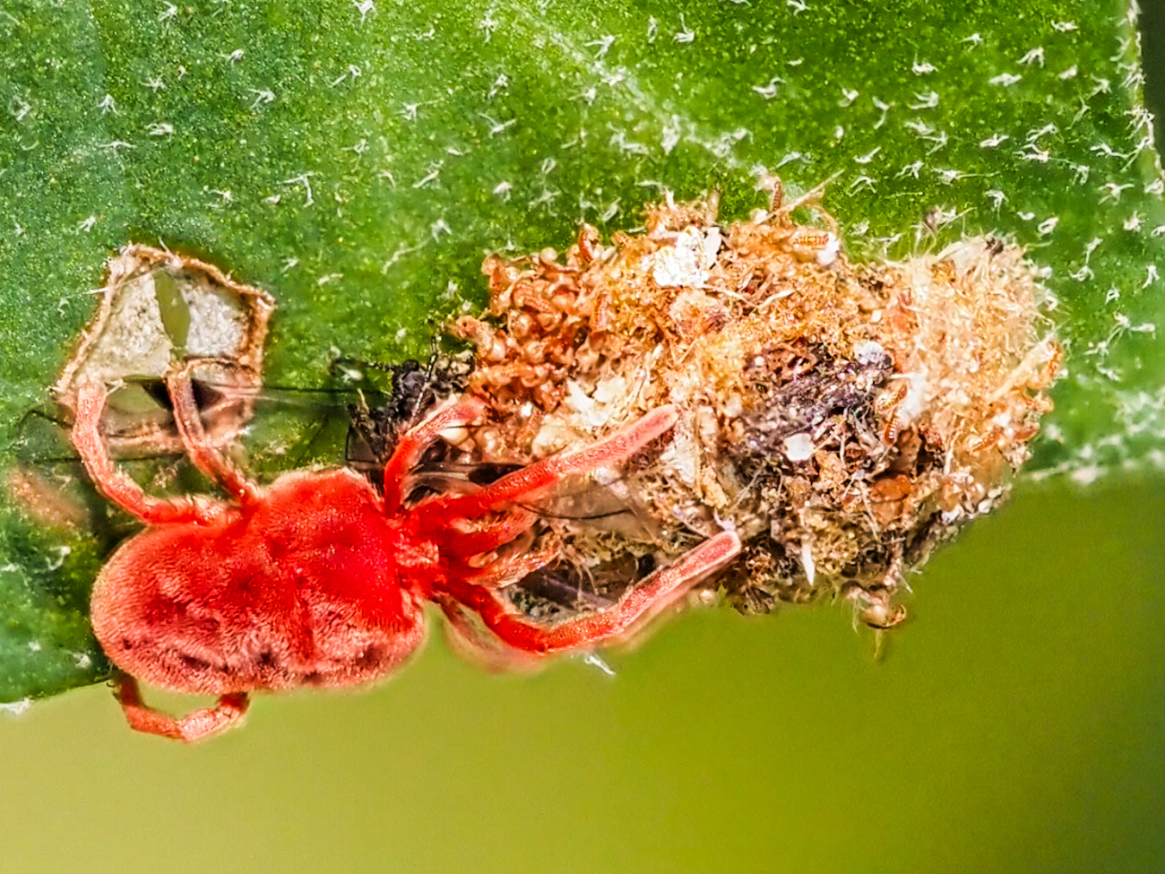 Foto 1 - 8: CH, GR, Mesocco, 650 m, 18.9.2025; Foto 9 - 11: Detailaufnahmen mit Beschriftungen; Foto 12 - 14: Samtmilbe hat eine Larve der Florfliege angegriffen und saugt sie aus. Gut zu sehen sind Überreste von Insekten auf der Florfliegenlarve. Fotos: CH, GR, Mesocco, 18.9.2025.