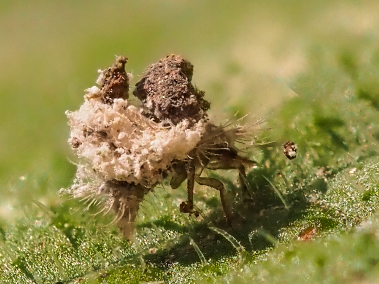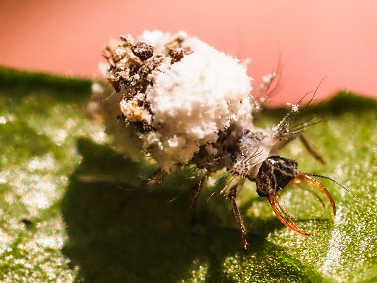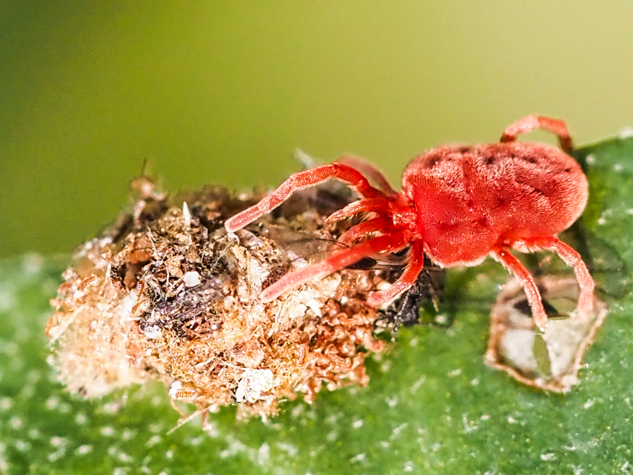 Foto 1 - 8: CH, GR, Mesocco, 650 m, 18.9.2025; Foto 9 - 11: Detailaufnahmen mit Beschriftungen; Foto 12 - 14: Samtmilbe hat eine Larve der Florfliege angegriffen und saugt sie aus. Gut zu sehen sind Überreste von Insekten auf der Florfliegenlarve. Fotos: CH, GR, Mesocco, 18.9.2025.