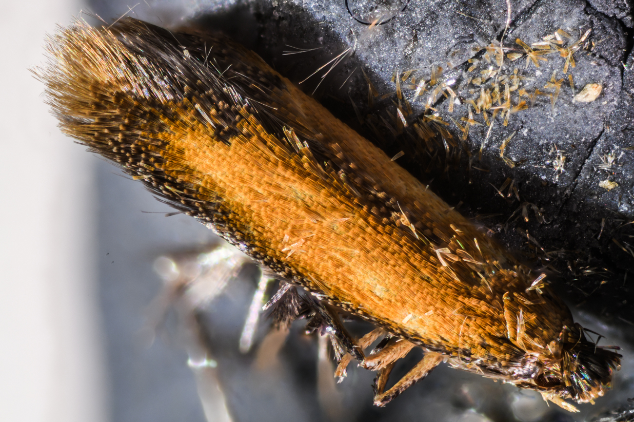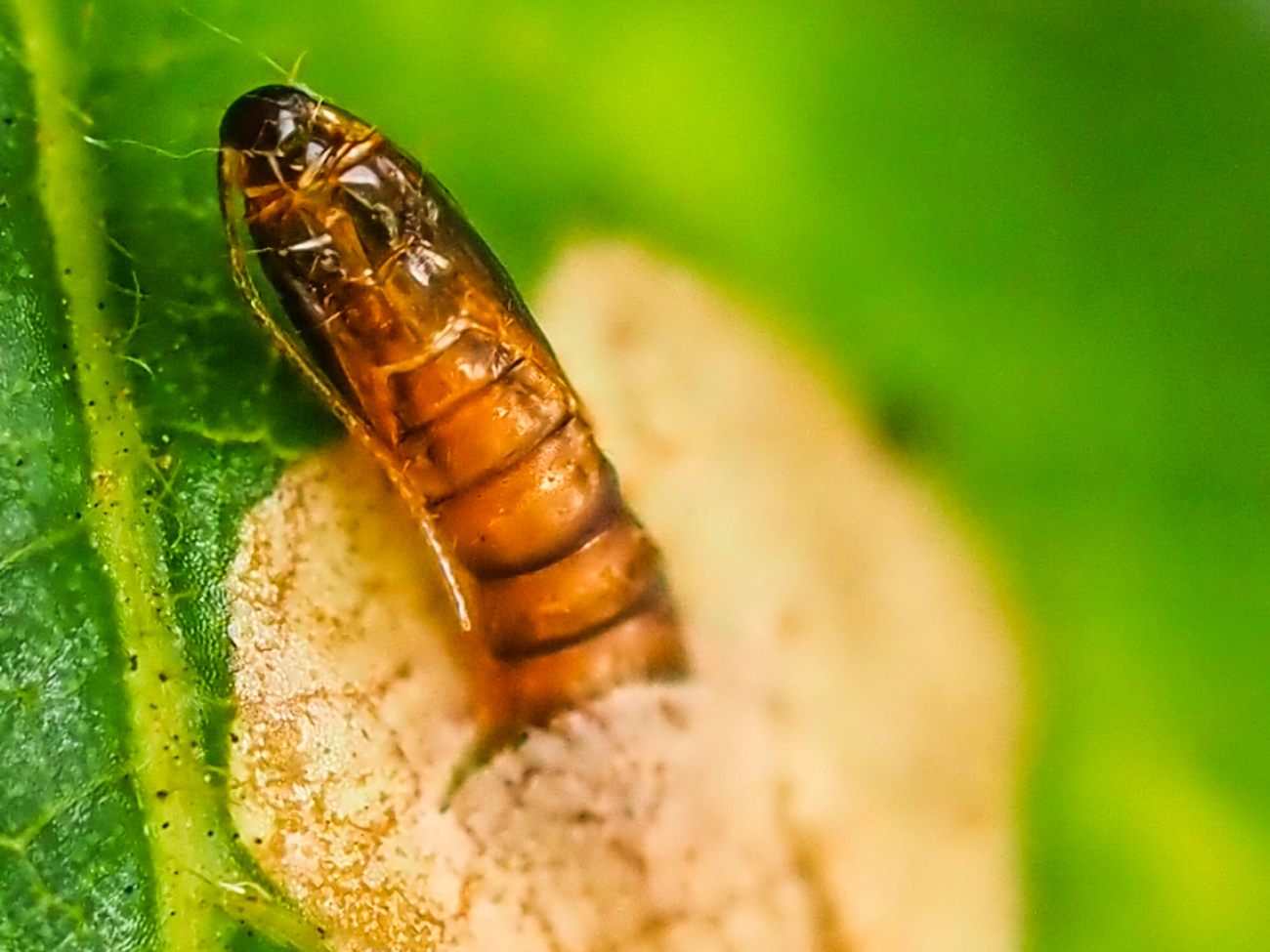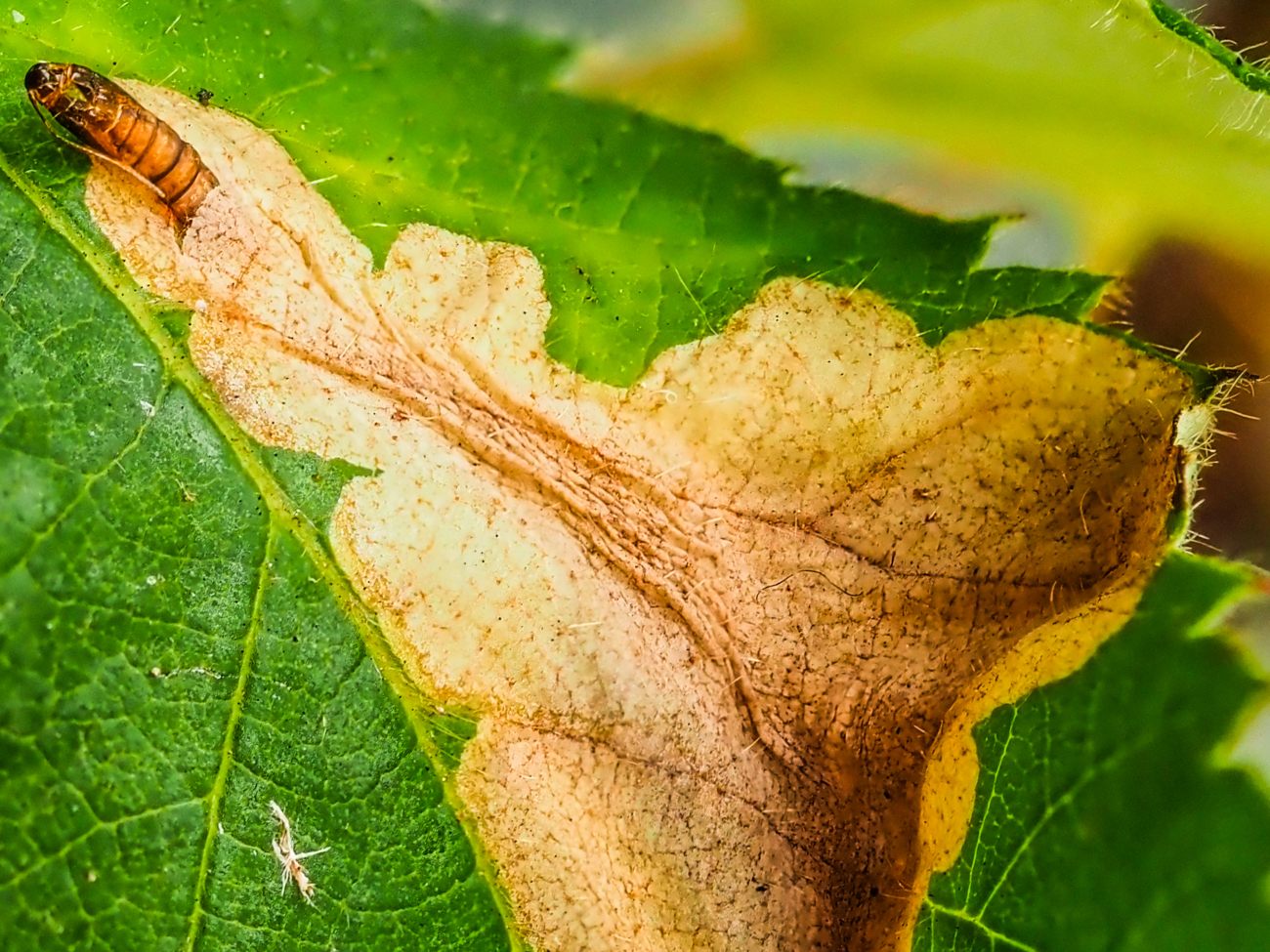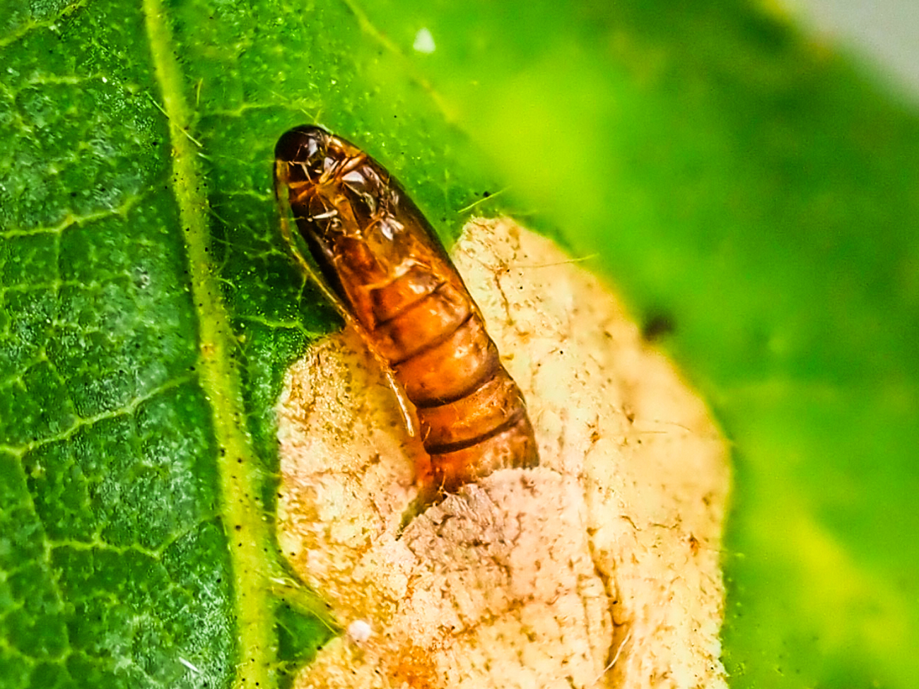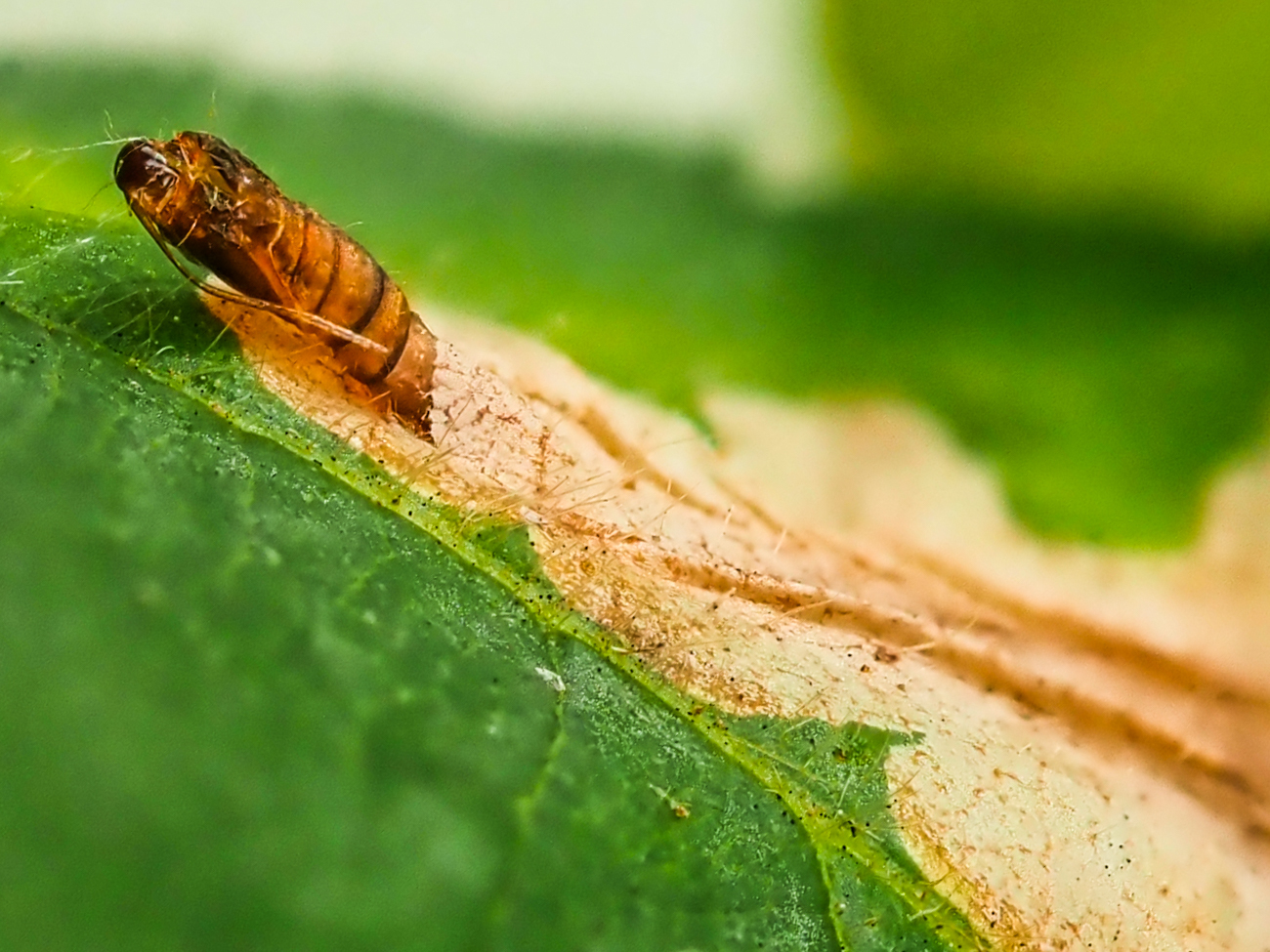 Foto 1 - 6: CH, SG, St. Gallen, 650 m, geschlüpft an Brombeerblatt, wo sie in der Ober- und Unterzeit das Blatt gefressen und dann verpuppt hat (siehe Frassspuren und Puppenhülle), 13.11.2025.