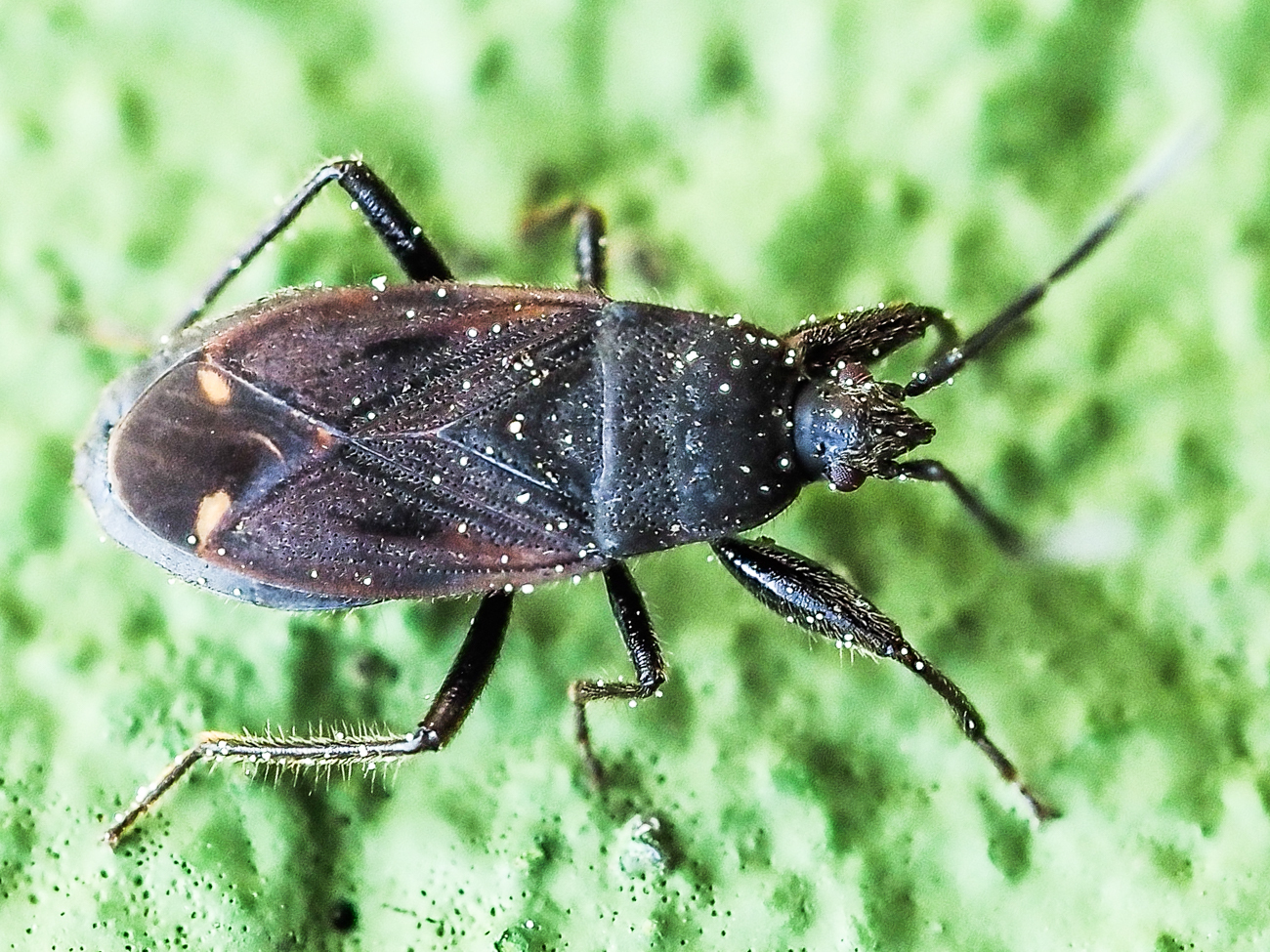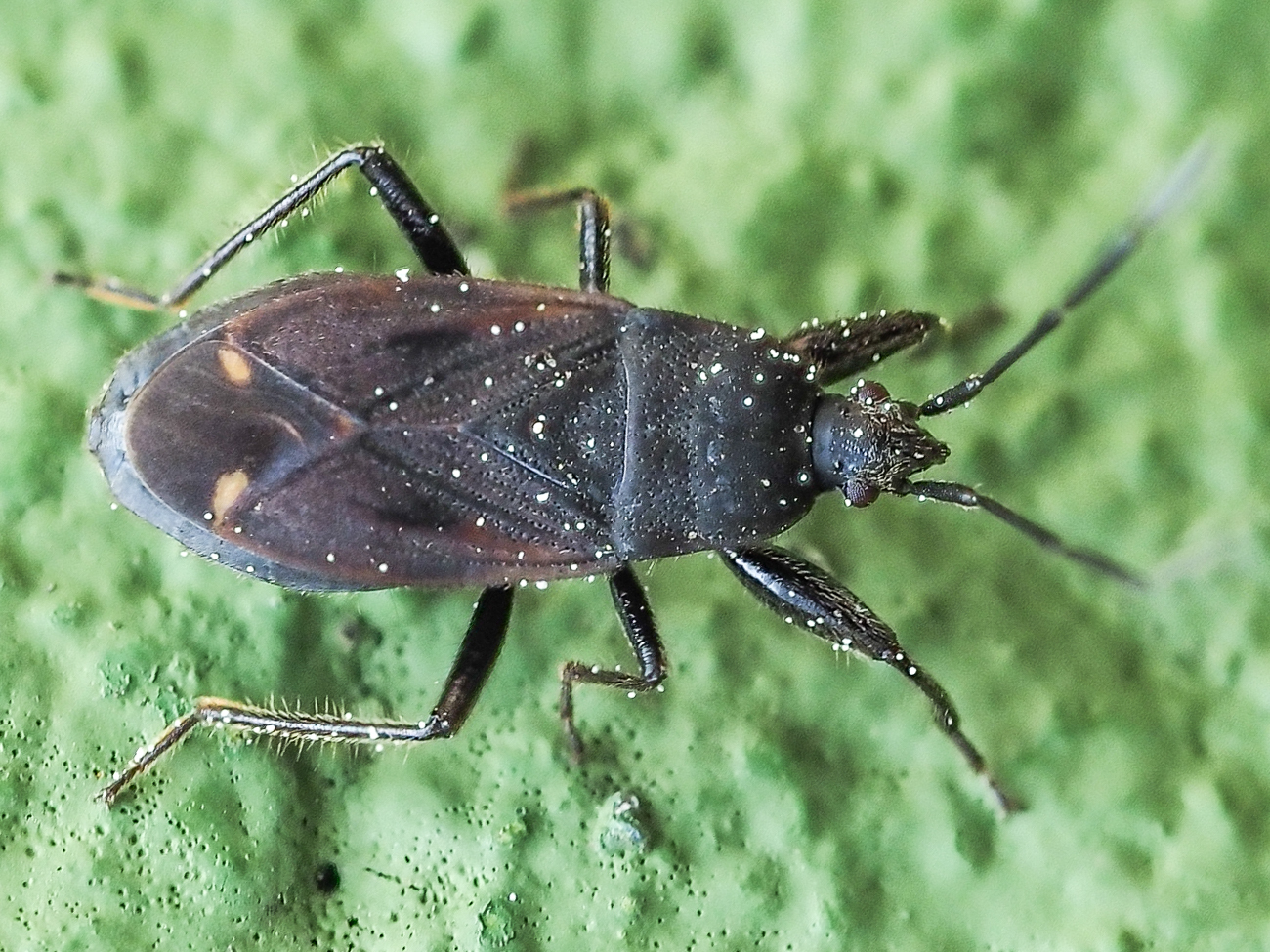 5,0 - 7,1 mm, rötlich braune Vorderflügel, Membrane, angrenzend an den Cuneus ein Paar halbkreisförmiger weißer Flecken, zwei große und mehrere kleine Dornen auf den Schenkel der Vorderbeine, lange, aufrechte Haare auf den Schienen (Tibien), die bis zu doppelt so lang sind, wie die Schienen breit.