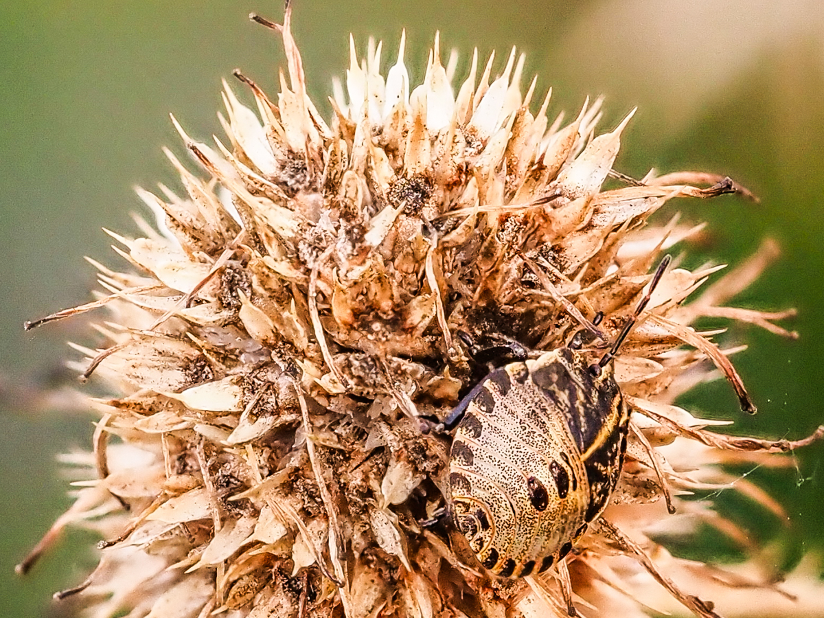 Familie: Pentatomidae (Baumwanzen). Auszug aus Wikipedia: Die Streifenwanze (Graphosoma italicum) ist eine Wanze aus der Familie der Baumwanzen (Pentatomidae). In der deutschen Literatur wurde sie meist unter dem Namen Graphosoma lineatum aufgeführt. Genetische Untersuchungen konnten aber plausibel machen, dass Graphosoma lineatum nur auf Sizilien und in Nordafrika vorkommt (pers. Anmerkung: ein Teil der Entomologen ist von dieser "Umbenennung" noch nicht ganz überzeugt).