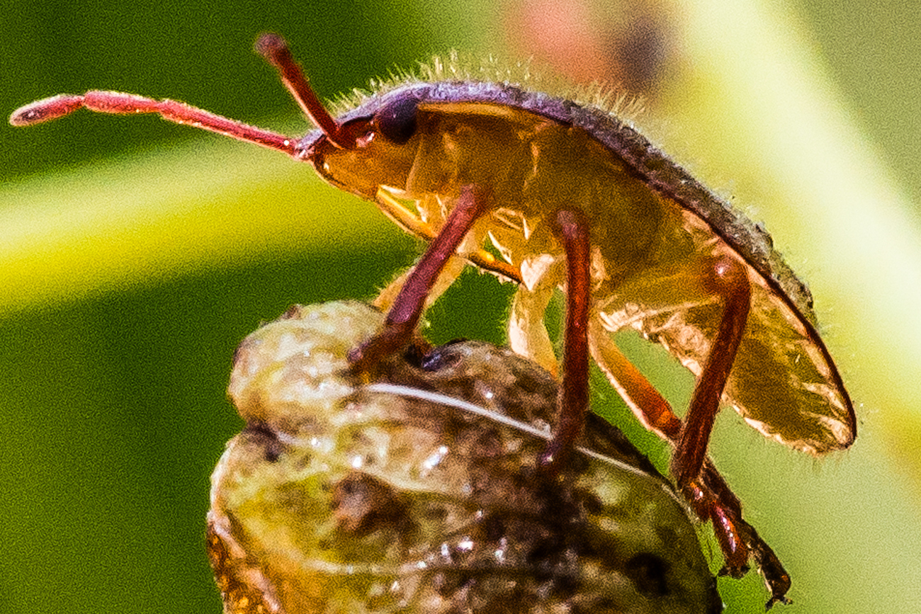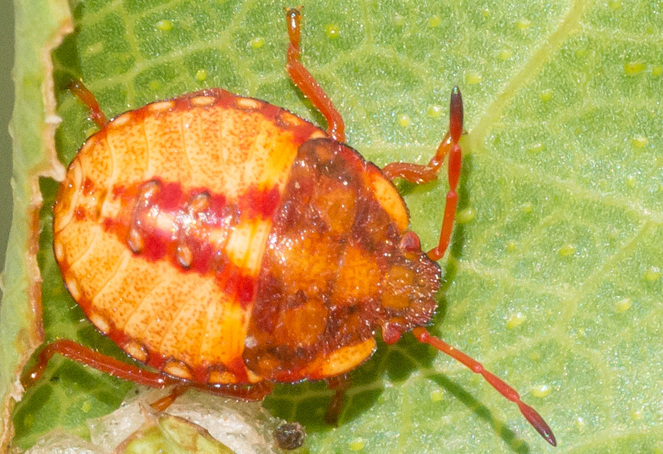 Familie: Pentatomidae (Baumwanzen). Vergleichsfotos von einer ähnlichen Nymphe konnten nicht gefunden werden, so dass eine genaue Bestimmung nicht möglich ist (u.a. Bathycoelia, Chinavia, Nezara, Agonoscelis, auch Coridius-Arten aus der Nachbarfamilie Dinidoridae).