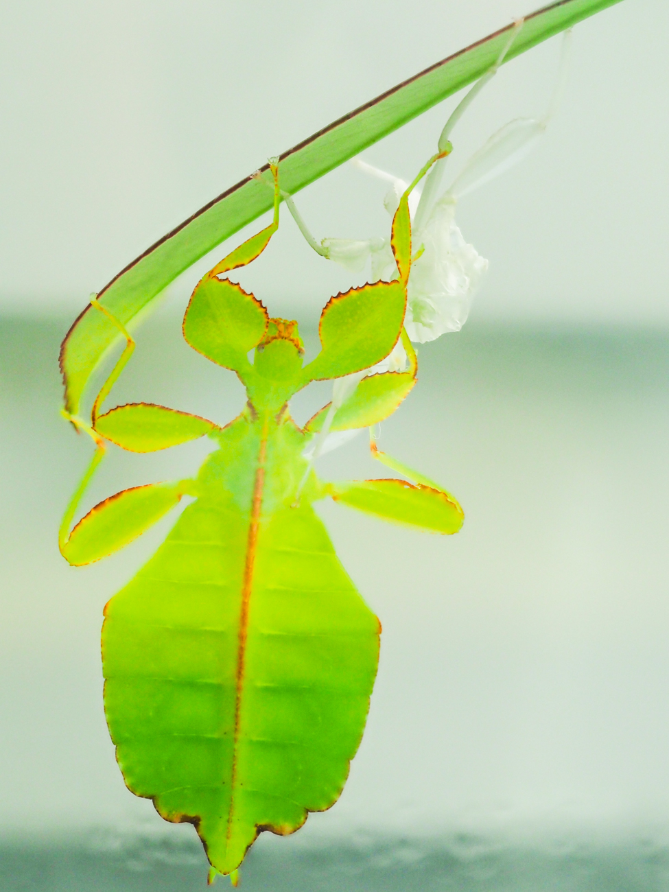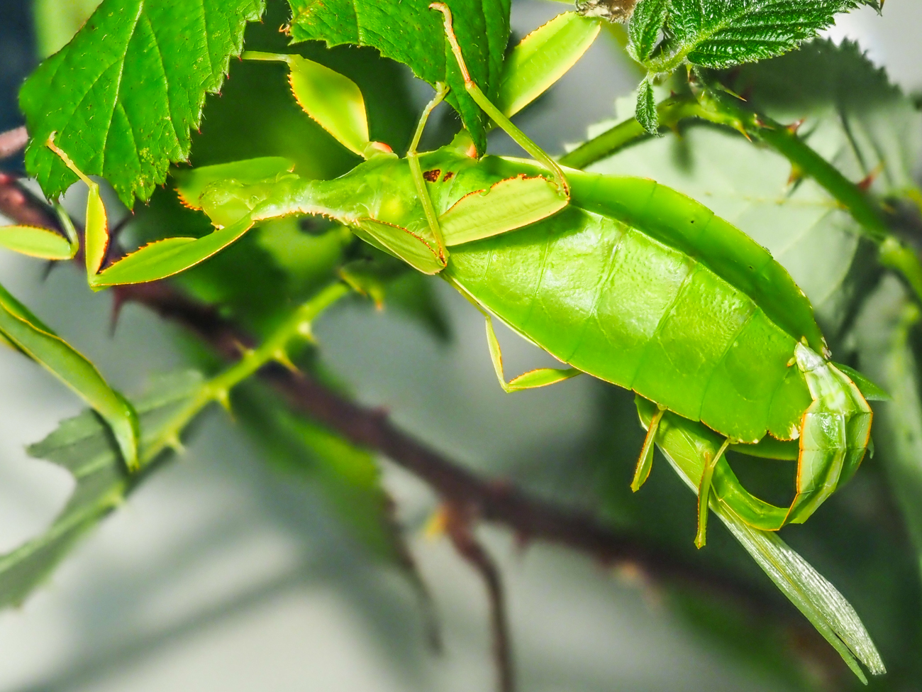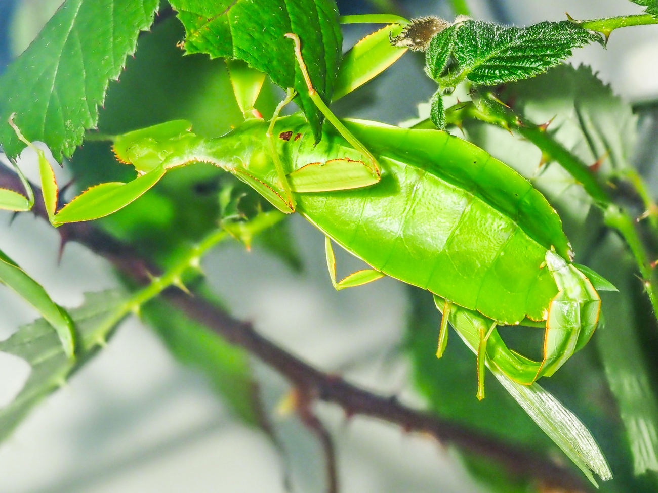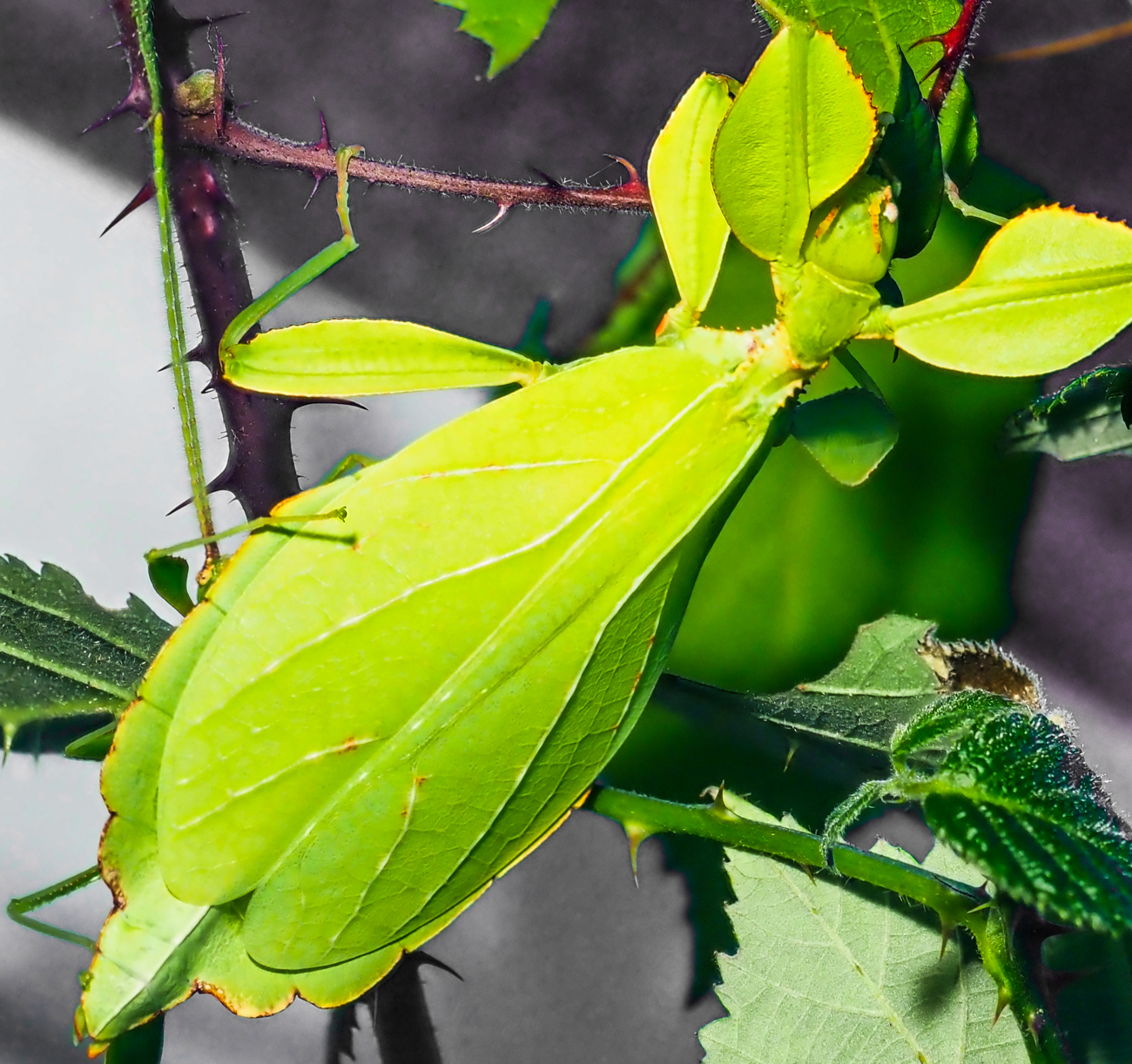 Ursprünglich Philippinen, heute verbreitet als "Haustiere", da sie sich gut züchten lassen. Lebensdauer 4 bis 6 Monate. Bevorzugen Temperaturen von 22 - 27 °C und Luftfeuchtigkeit 60 bis 80 %. Futterpflanze hauptsächlich Brombeerblätter. Verschiedene Fotos auch von Häutung. Die Tiere fressen nach der Häutung ihre Haut, die Beinhäute lassen sie aber vielfach liegen. Foto 18 - 20: Haut nach der Häutung von Fussgelenk und Kniegelenk. Jedes kleinste Härchen häutet sich. Foto 21 und 22: Weibchen, paarungsbereit, mit werbenden Männchen, 3.12.2025; Foto 23 - 25: Mundwerkzeuge des Weibchens (kurze Fühler), damit können sie auch leicht verholzte Brombeerstängel mit den Stacheln fressen; Foto 26 - 28: Männchen mit langen Fühlern; Foto 29 - 32: Kopula (Paarung); Foto 33: Körper-Hinterteile Männchen; Foto 34 und 35: Körper-Hinterteil Weibchen.