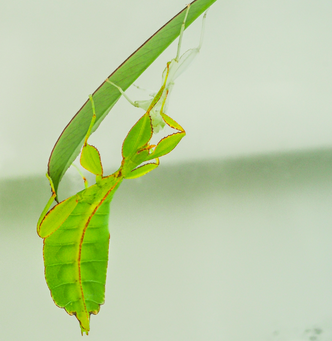 Phyllium philippinicum mit Kopulation Paarung (Wandelndes Blatt mit Paarung)
