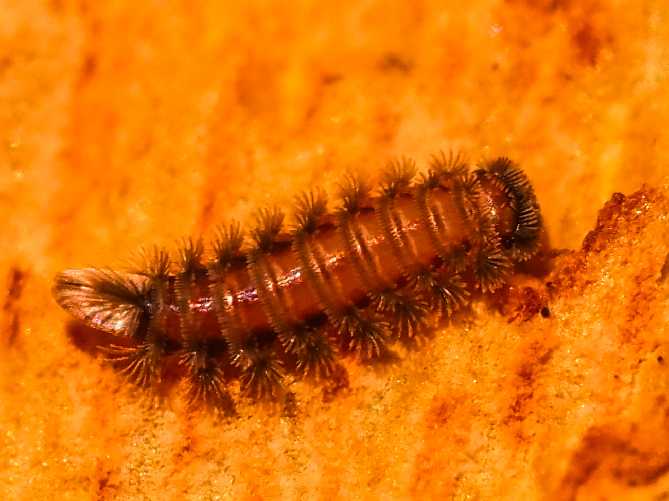 Bisher sind in Mitteleuropa keine weiteren Vertreter von Borstenfüsser bekannt. Sie sind vor allem unter loser Baumrinde zu finden, wo sie in Gruppen leben. Fotos: CH, St. Gallen, 30.11.2020. Wie praktisch alle Doppelfüsser häuten sich auch die Pinselfüsser. Die Fotos 7 und 8 zeigen die Haut nach der ca. 6. Häutung (ca. 0.6mm gross); Foto 9 - 11: CH, SG, St. Gallen, 650 m, 18.7.2024; Foto 12: D, Weil am Rhein, 26.7.2024; Foto 13 und 14: CH, SG, St. Gallen, 650 m, an Tanne, 18.8.2025; Foto 15: CH, TI, Ascona, 220 m, 30.10.2025.