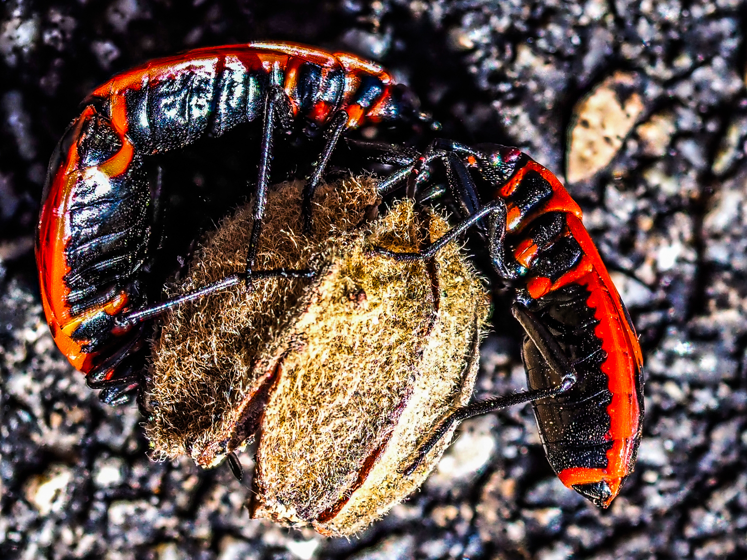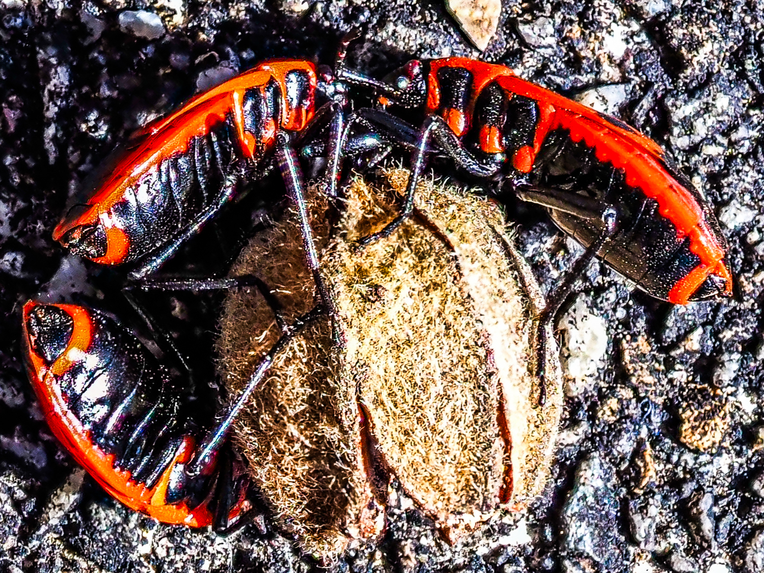 Pyrrhocoris apterus - Werkzeuge und Chemie-Labor im Körper (Feuerwanzen, zum Teil mit Missbildungen)