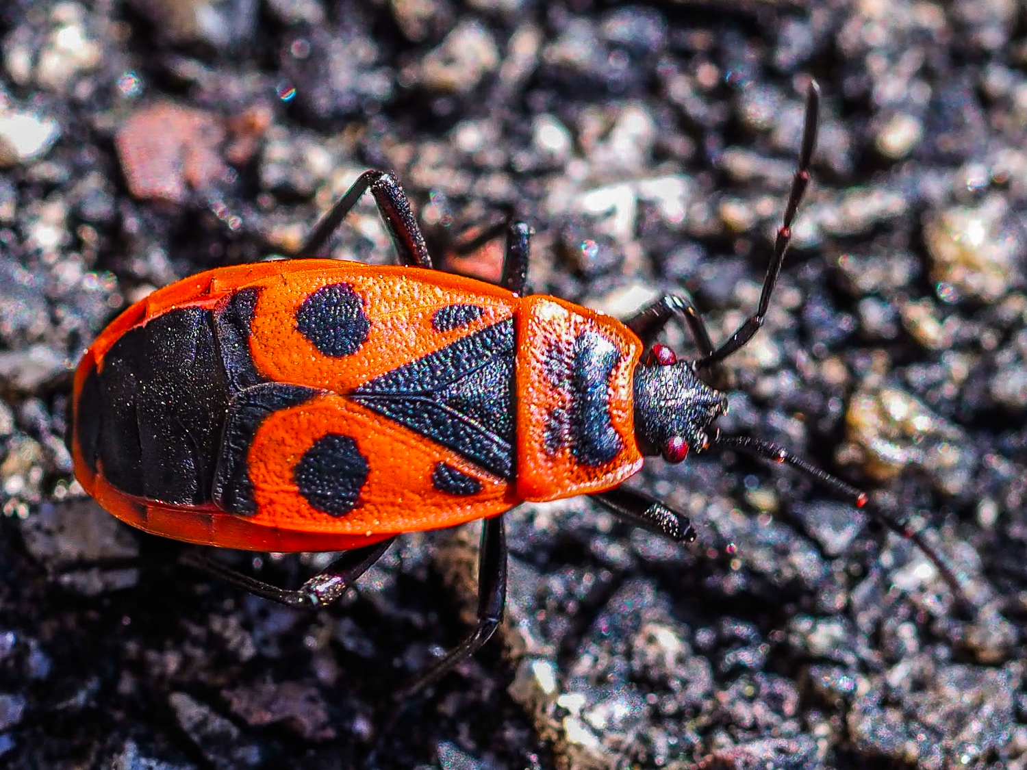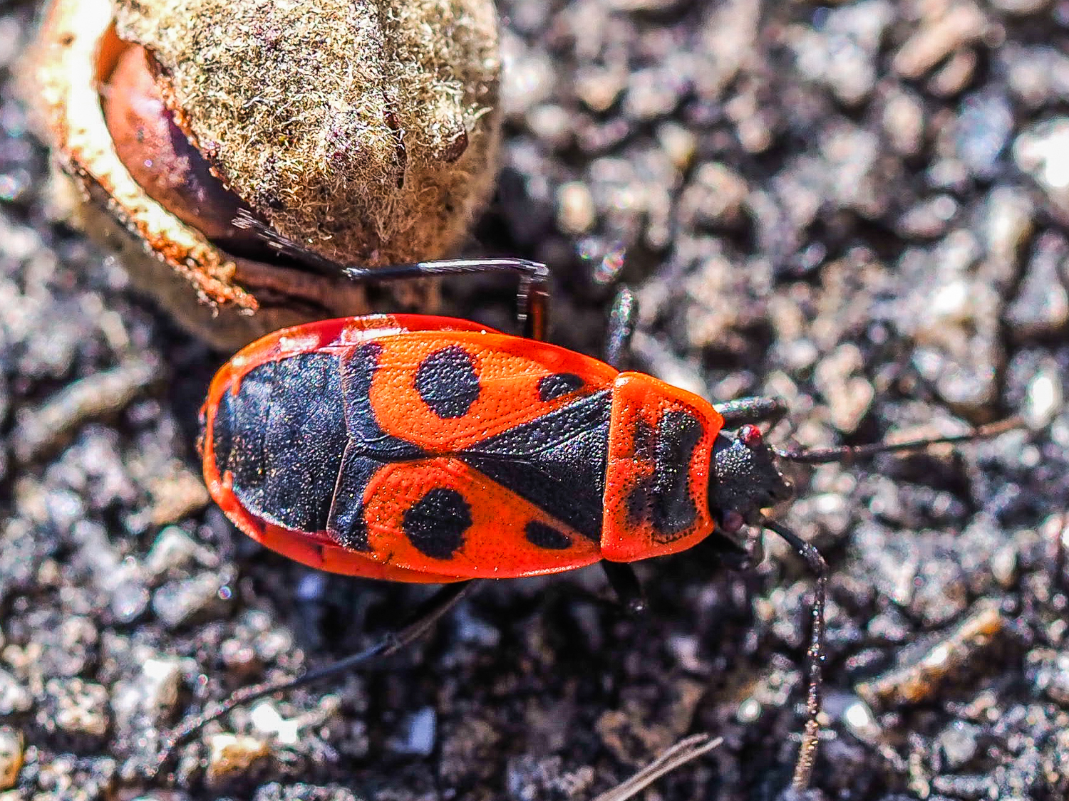 Eine der häufigsten Wanzen, die bereits an warmen Februartagen bis in den Spätherbst angetroffen werden kann.Flugunfähig, lebt sehr gesellig (vor allem Jungtiere) am Boden, an Stämmen oder auf Steinen, vorwiegend in Nähe von Linden und Robinien. Foto 1: 12.6.06, CH, TI, Solduno, 230 m; Foto 2: 19.8.07, CH, SG, Wartensee; Foto 3: 12.11.06, CH, TI, Solduno, 230 m, Gruppenbildung; Foto 4: 19.8.07, CH, SG, Wartensee, Junggruppe; Foto 5: 13.7.05, CH, TI, Solduno, Gruppenbildung; Foto 6 - 8: CH, TI, Gordola, 340msm, 24.4.2021; Foto 9 - 11: CH, TI, Orselina, 450msm, 4.4.2021; Foto 12: D, Kaiserstuhl, Liliental, 8.9.2021 mit Deformation (vermutlich eine Missbildung, die beim Schlüpfen entstanden ist und bei Wanzen hie und da auftreten kann; vergleiche dazu Zeichnungen von Cornelia Hesse-Honegger: https://de.wikipedia.org/wiki/Cornelia_Hesse-Honegger); Foto 13: CH, SG, St. Gallen, 650msm, 3.6.2022, Nymphe; Foto 14 - 16: D, überlingen (Bodensee), an Malven, 12.10.2022; Fotos 17 - 20: CH, SG. St. Gallen, 20.6.2023, Nymphen, auf Foto 17 mit erbeuteter Ameise, auf Foto 18 und 19 mit Larve von Ameise; Foto 21 - 23: grosse Ansammlungen von Feuerwanzen kann man vor allem an Linden sehen. Paris, F, 18.3.2023; Foto 24 und 25: CH, SG, St. Gallen, 650 m, 27.4.2023, Paarung; Foto 26: CH, SG, St. Gallen, Missbildung, 14.9.2022; Foto 27: CH, TI, Bignasco, Maggiatal, 5.11.2023; Foto 28 - 30: CH, TI, Gudo, 400 m, 16.2.2024; Foto 31 - 33: Nymphen saugen eine Fliege aus; CH, SG, St. Gallen, 650 m, 26.5.2024; Foto 34 - 36: Nymphen saugen eine kleine Ameise aus; CH, SG, St. Gallen, 650 m, 26.5.2024; Foto 37 und 38: CH, SG, St. Gallen, 650 m, 18.7.2025, Feuerwanze saugt Biene aus; Foto 39 und 40: CH, ZH, Halbinsel Au, 30.7.2025, Missbildung von Feuerwanze; Foto 41: CH, SG, Wartensee, 20.8.2007; Foto 42 - 45: CH, SG, St. Gallen, 650m, 27.2.2026 - saugen Hibiscussamen aus (verwandt mit Linden, deren Samen sie dank ihrem speziellen stechend-saugenden Mundrüssel durchstechen können. Sie injizieren ein zersetzendes Sekret (Speichel mit Verdauungsenzymen) direkt in den Samen. Dieser wird dadurch im Inneren verflüssigt, so dass sie dies dann aufsaugen können. Zudem haben sie im Darm symbiotische Bakterien, die helfen, giftige sekundäre Pflanzenstoffe im Samen abzubauenund fehlende lebensnotwendige B-Vitamine zu produzieren, die in den Samen allein nicht ausreichend vorhanden sind. Sie haben also nicht nur ein Werkzeug, sondern auch ein Chemie-Labor im Körper.